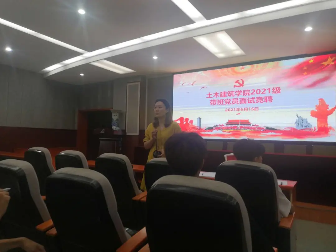 2021级带班党员招新面试在土建楼200隆重举行。学生党员教育管理中心指导老师万雯怡以及20级带班党员、各支部部分党员参加了本次活动。