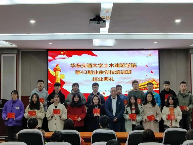 2020年11月27日下午,第43期业余党校培训班结业典礼在土建楼200举行。出席本次结业典礼的有院党委副书记兼分党校副校长郑轶老师、院学工办主任兼团委书记闫伟老师、院党委组织员兼党员教育管理中心负责人万雯怡老师及本期培训班学员