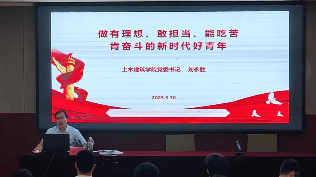 党委书记刘永胜为土建学院分党校第十期发展对象培训班学员讲授党课——《做有理想、敢担当、能吃苦、肯奋斗的新时代好青年》。