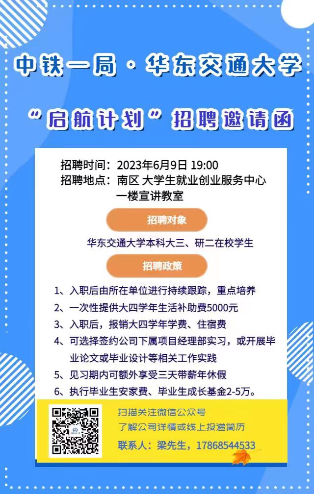 为优化关键岗位人才配置及核心岗位人才储备,提升企业人才竞争力,中铁一局在部分院校面向2024届毕业生在校学生实施“启航计划”。学生与中铁一局签订《“启航计划”就业意向书》后,列入“启航计划”专项管理,享受以下政策: