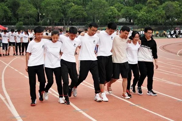 “一二一,一二一”,八个人肩抵着肩,喊着统一的口号,迈着整齐的步伐向着终点前行。“八人九足”考验的是队伍的协作能力,默契在此刻是最大的王牌。