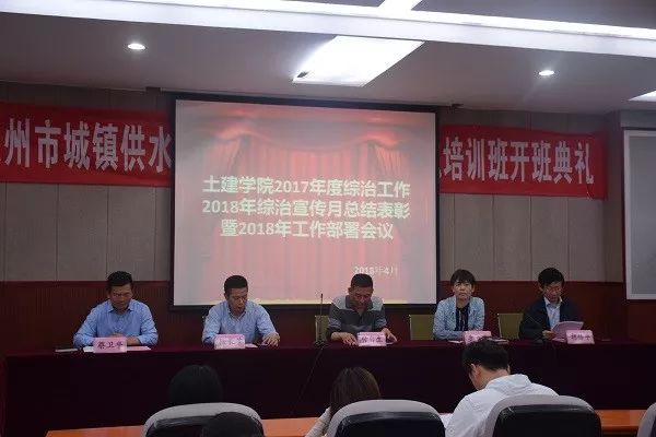 2017年度综治工作2018年综治宣传月总结表彰暨2018年工作部署会议于土建学院学术报告厅胜利召开。校保卫处处长付自生、土建学院党委书记李立玲、土建学院院长徐长节、常务副院长胡锋平、院党委副书记蔡卫平出席本次会议。会议由土建学院学工办主任闫伟主持。