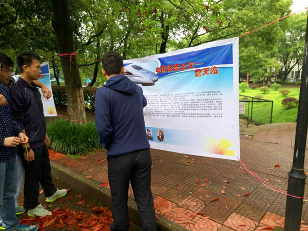 “詹天佑先生被誉为中国铁路之父和现代工程之父……”天佑班的学生在展板前为路过的同学们讲解詹天佑的事迹,人来人往间,已经有不少同学驻足倾听,听到精彩处还会为詹天佑先生的才华感叹。展板上明确记录了詹天佑在中国铁路事业上做出的卓越贡献,著名的京长铁路、川汉铁路等工程彰显了一代伟人的光辉岁月。