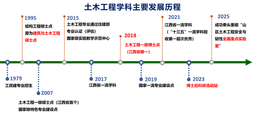 学科体系完善:学院建有江西省唯一的土木工程“本科—硕士—博士—博士后”全链条人才培养体系。学院共设有11个系部,本科生层面设有4个国家级一流专业建设点(土木工程、给排水科学与工程、工程管理、建筑学)、2个省级一流专业建设点(建筑环境与能源应用工程、环境工程)、1个教育部“新工科”本科专业(智能建造),其中土木工程、给排水科学与工程、建筑学已通过住建部专业评估(认证)。研究生层面,拥有江西省唯一的土木工程一级学科博士点、2个一级学科学术学位硕士点、3个专业学位硕士点,并设有土木工程博士后科研流动站。土木工程学科连续入选江西省“十三五”“十四五”一流学科,并在“十三五”验收中获评第一层次“优秀”。