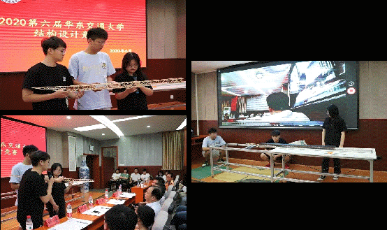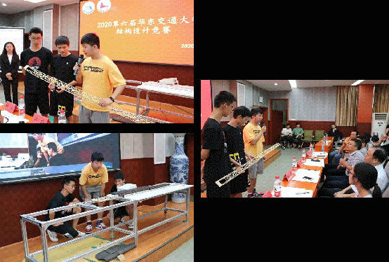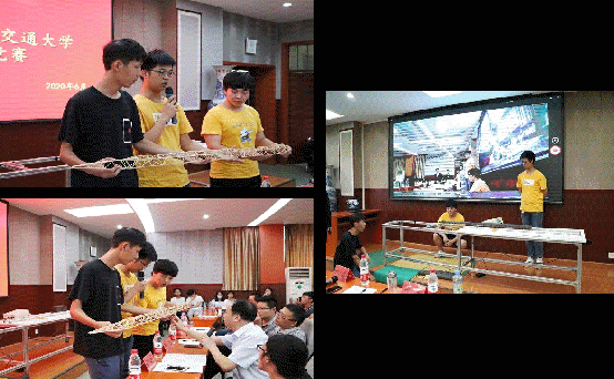 该组成员分别是:易钰清、郑思源、刘玥,该组采用梯形截面,通过测试发现问题,在承重比较大的地方加了连杆增加模型的抗压能力。他们提到之前的模型由于高度过高会出现侧翻所以在容易侧翻的地方加连杆。在加载过程中该组员对加载块谨慎摆放,一丝不苟,最后该组模型顶推成功,评委老师也进行了认可。