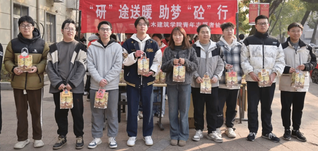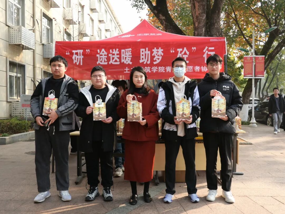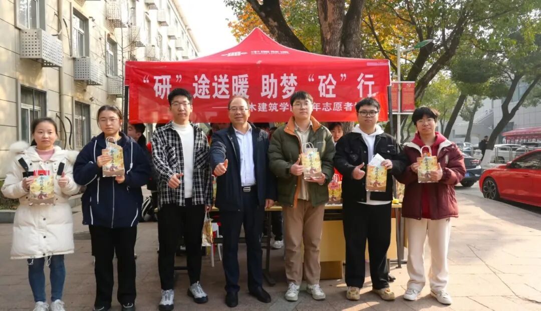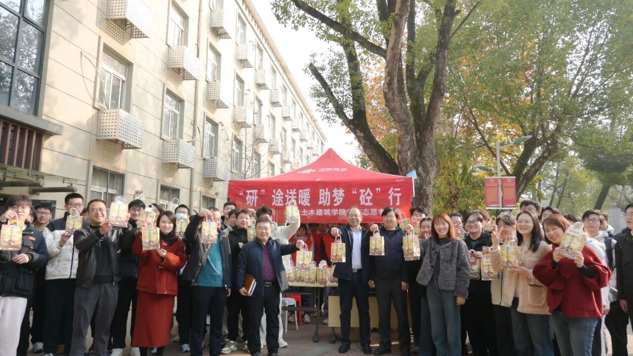 于学8栋楼前开展“‘研’途送暖,助梦‘砼’行”考研慰问活动。院长庄海洋、院党委副书记郑轶、副院长陈莘莘、方焘及毕业班辅导员参加活动。