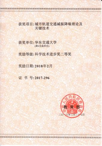为第一完成单位,由雷晓燕教授主持完成的成果“城市轨道交通减振降噪理论及关键技术”荣获2017年度高等学校科学研究优秀成果奖科学技术进步奖二等奖。