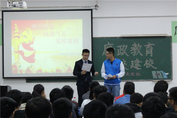 “领导,冒号!”詹天佑班的学生创新传统班会形式,利用小品、主题演讲、签名、宣誓等新型方式,展现自身对廉政教育的看法和认识,同学们各抒己见,会议气氛热烈。“我们要严守党纪国法的底线,克制欲望,清风正气。”16詹天佑2班班长宋长福如是说。