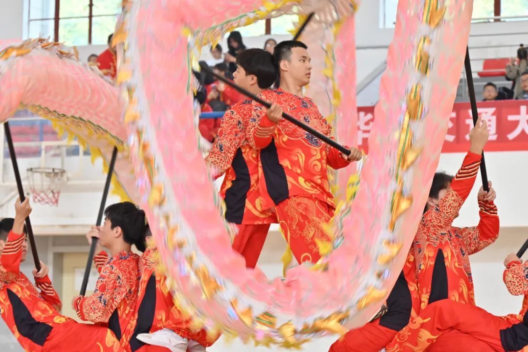 队员们身着色彩斑斓的传统服饰,手持龙珠、龙头、龙身和龙尾,他们的动作整齐划一,步伐轻盈而有力。随着激昂的音乐节奏,他们舞动着巨龙,仿佛赋予了它生命。龙身在空中翻腾,龙尾随之摆动,每一个动作都充满了力量与美感,仿佛一条真正的龙在云端翱翔。