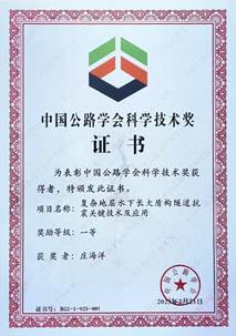 中国公路学会科学技术奖是由国家科学技术奖励工作办公室批准2002年设立,是面向全国公路交通行业的权威科技奖项,奖励在公路交通科学技术进步中作出突出贡献的个人和组织。2022年度,共评选出205项获奖项目。其中,科学技术奖202项(特等奖7项,一等奖44项,二等奖91项,三等奖60项),科普类奖3项(一等奖1项,二等奖1项,三等奖1项)。