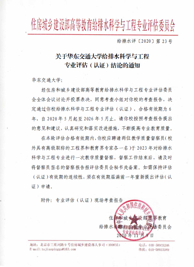 给排水科学与工程专业评估(认证),合格有效期为6年,自2020年5月起至2026年5月止。