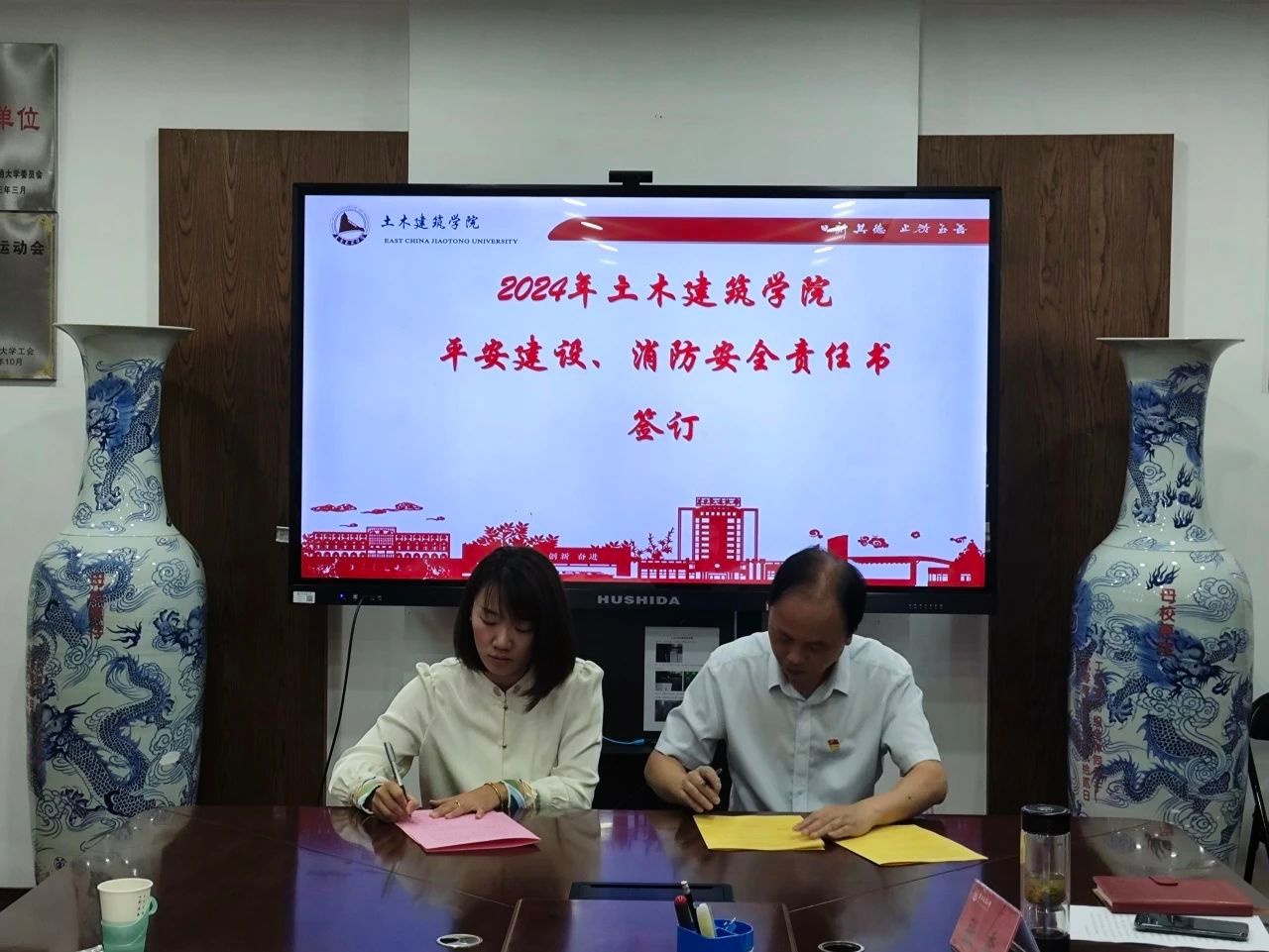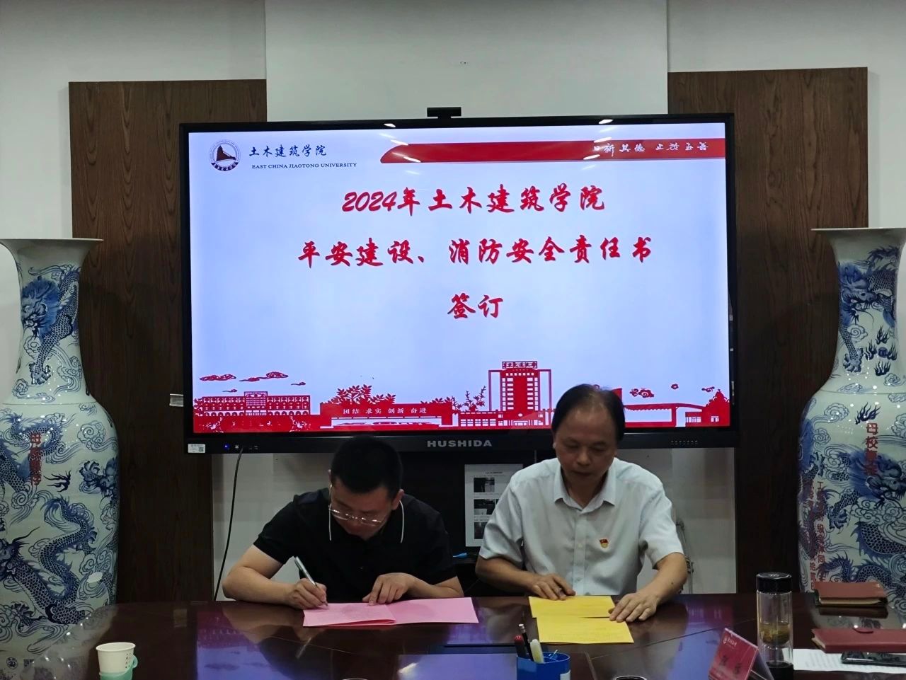 会议最后,陈水生与系部代表现场签订《2024 年平安建设责任单位平安建设目标管理责任书》、《2024年院属单位消防安全责任书》。
